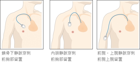 鎖骨下からのアプローチで前胸部留置を基本としていますが、患者さんの状態に応じてアプローチ経路(内頚静脈、上腕静脈、大腿静脈など)、留置部位(上腕・前腕、大腿部など)へ変更する場合もあります。留置希望部位があればご指示ください。